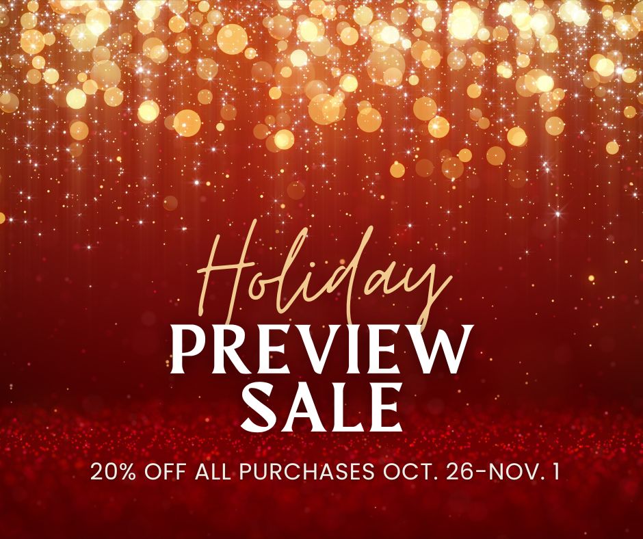 Our Holiday Preview Sale kicks off October 26, with 20% off all purchases through November 1. From November 2–9, enjoy 15% off as the holiday spirit keeps rolling. Get first pick on ornaments, dé...